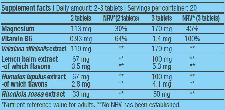 The composition includes vitamin B6 to maintain the normal functioning of the nervous system and quickly absorbed magnesium bisglycinate, which supports muscle and nerve function. Extracts of valerian, rhodiola rosea, hops and lemon balm contribute to a natural calming effect and relieve tension during the day and evening.