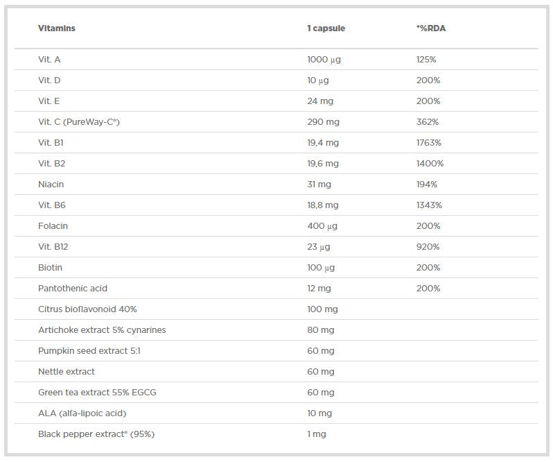 The ingredients are chelated minerals, which improves their digestibility and effect. The unique formula includes bioflavonoids and bioperine for increased absorption by up to 60%, as well as extracts of saw palmetto, nettle, pumpkin seed, ginkgo biloba and silymarin, which contribute to antioxidant protection and overall vitality.