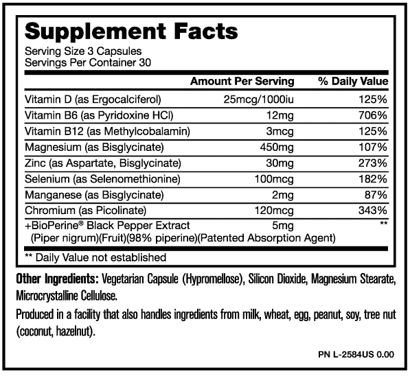 Съставки: Витамин B6, Магнезий, Цинк, BioPerine (екстракт от черен пипер), капсула. Добавеният екстракт от черен пипер подпомага по-добра абсорбция и ефективност на активните съставки.