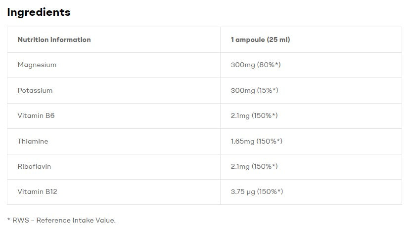 Ампулната формула осигурява удобна доза и съдържа магнезий за нормално мускулно функциониране, калий за водно-електролитен баланс и витамини B1, B2 и B12 за енергия и нервна система. Това подпомага предотвратяването на крампи, ускорява възстановяването и повишава фокуса по време на тренировка.