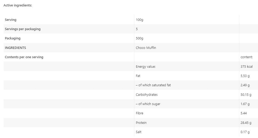 Шоколадовият мъфин с високо съдържание на протеин е перфектен избор за всички, които искат да увеличат дневния си прием на протеини по вкусен начин. Този продукт е идеален както за активни спортисти, така и за хора, които просто искат да поддържат добра форма и здраве. Високото съдържание на протеин спомага за строежа на мускулите и подпомага възстановяването след физическо натоварване, като същевременно предлага удоволствие от шоколадовия вкус.