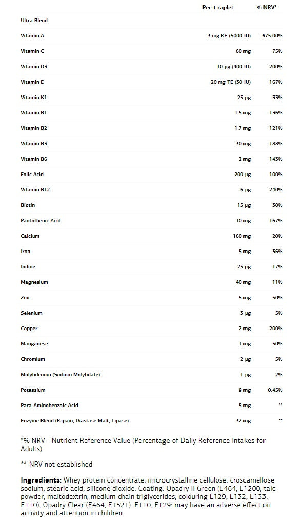 Daily 1 съдържа смес от 25 витамини и лесно усвоими минерали, включително фолиева киселина, витамин C, витамин K1, витамин B12, желязо, магнезий и цинк, което подпомага клетъчните функции и енергийното производство. Формулата помага на организма да усвоява хранителните вещества с помощта на храносмилателни ензими, поддържайки висока жизнена енергия и добро общо благосъстояние. Специално разработен за активни хора и спортисти, Daily 1 подпомага възстановяването след натоварване и поддържа концентрацията през целия ден.