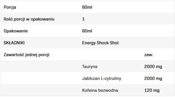 Energy Shock е готов за употреба – просто разклатете добре и изпийте минути преди да влезете в залата. В една доза има 120 мг кофеин, таурин и цитрулин малат, които работят синергично за увеличаване на енергията, издръжливостта и концентрацията. Удобната опаковка от 80 ml е идеална за спортисти, които често са в движение, и позволява лесно да се вземе навсякъде.