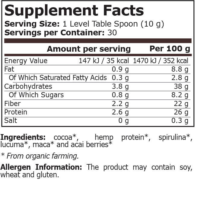 Какаото добавя антиоксиданти и приятен шоколадов вкус, докато конопеният протеин осигурява пълен аминокиселинен профил за възстановяване и растеж на мускулите. Спирулината поддържа жизненост и детоксикация, мака служи като адаптоген за повишаване на издръжливостта и хормоналния баланс, а асай добавя витамини, Омега 3-6-9 и имунна подкрепа. Тази смес е сертифицирана органична и подходяща за вегани, предоставяйки чиста и балансирана хранителна основа за ежедневието.