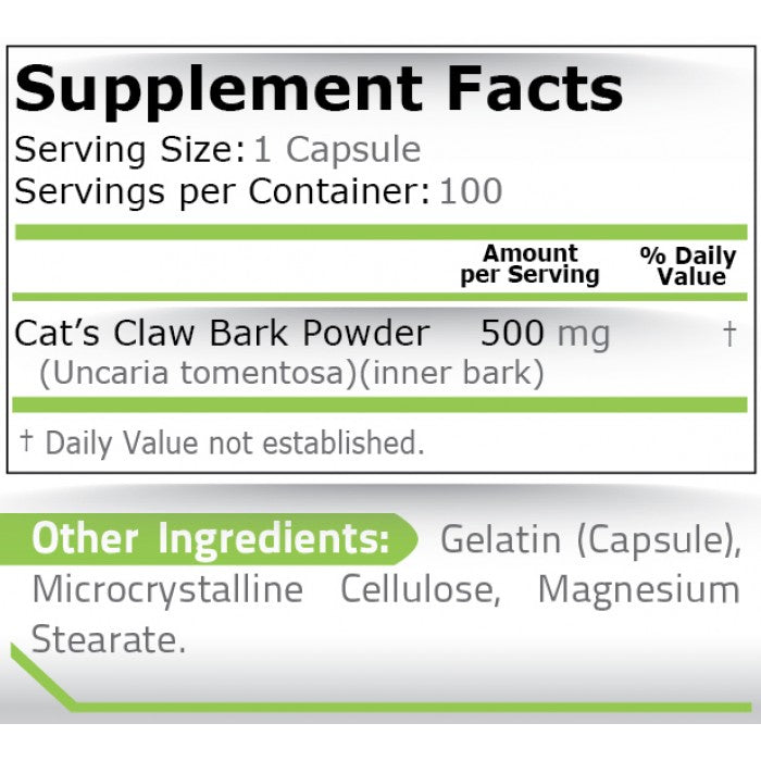 Котешкият нокът представлява пълзяща лоза от тропическите гори на Амазонка, която се използва за извличане на екстракти в различни форми. В капсулна форма Cat's Claw 500 мг обединява суровината в удобна за приемане доза, фокусирана върху имуностимулиращ ефект, особено полезен за спортисти и активен начин на живот. Разновидността Uncaria tomentosa е известна с имуностимулиращия ефект и подпомага Т-имунните клетки и макрофагите, което може да помогне при вирусни инфекции и общо възстановяване.