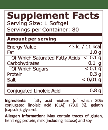 CLA е уникална полиненаситена мастна киселина, а във всяко драже е 800 mg конюгирана линолова киселина (CLA). Приемът в умерени дози спомага за намаляване на телесните мазнини дори и за редовно трениращите атлети. Ефектът се дължи на блокирането на липопротеин липаза (LPL) – ензим, необходим за задържането на мазнини в организма, което насърчава изгарянето им за енергия. При активно спортуващите CLA подпомага натрупването на мускулна маса дори без промяна в тренировъчния режим и хранителния режим.