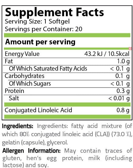 CLA на Pure Nutrition е свободен от стимуланти и термогени, като във всяко драже има 800 mg конюгирана линолова киселина (CLA). В малки количества CLA се намира в месото и млечните продукти, а приемът в умерени дози чрез добавка спомага за термогенезата — процес, при който тялото произвежда топлинна енергия, ускорява метаболизма и подпомага изгарянето на калории и телесни мазнини. CLA е полезен и с това, че повишава инсулиновата чувствителност и подпомага чревната микрофлора.