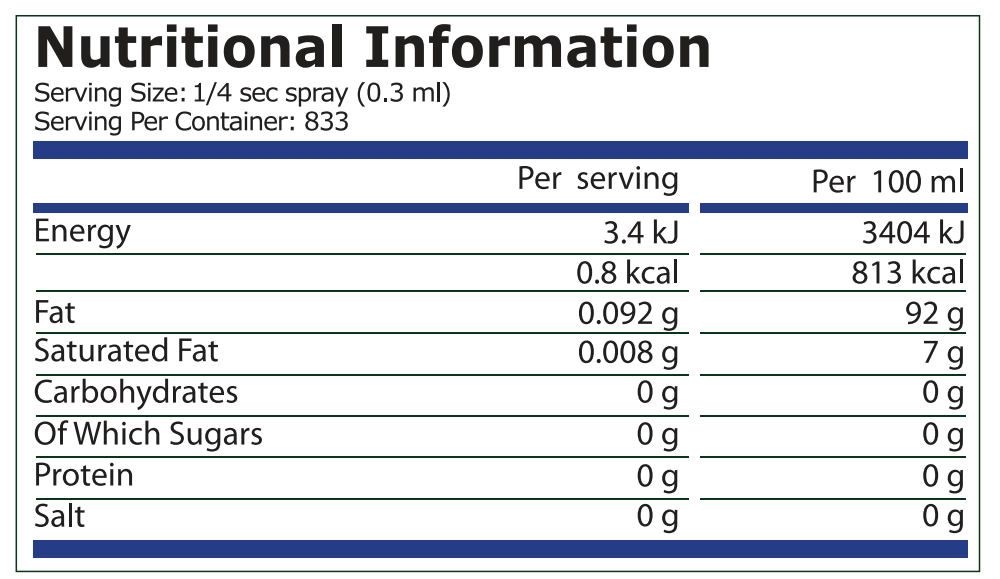 Спрейът съдържа 63% рафинирано рапично масло и аромат на масло, без ГМО. Той осигурява тънък, равномерен слой върху повърхностите на тигани, форми за печене, стъклени съдове и грилове, като предотвратява залепването и улеснява почистването. Подходящ е за месо, хрупкави печени картофи, салати, печене и десерти.